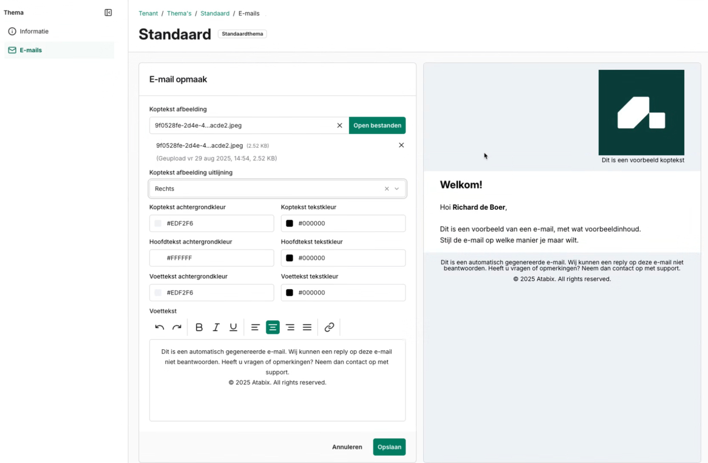 Voor de mails kun je een Koptekst, een afbeelding, de achtergrondkleuren en een voettekst instellen.
